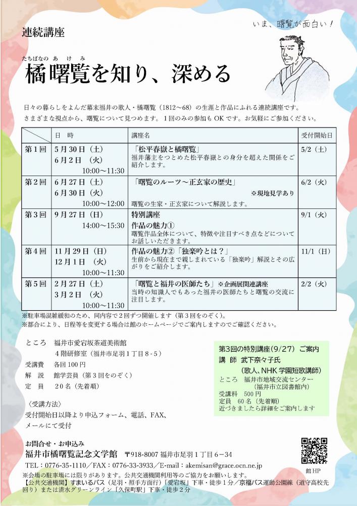 令和8年度より連続講座「橘曙覧を知り、深める」をスタートします。